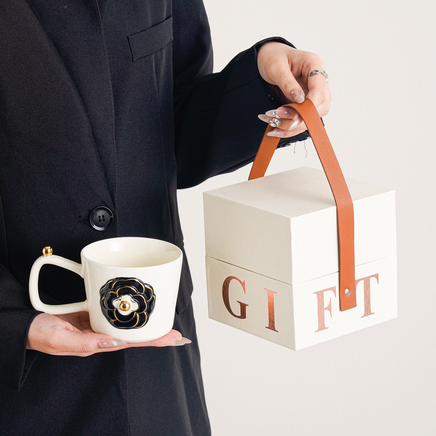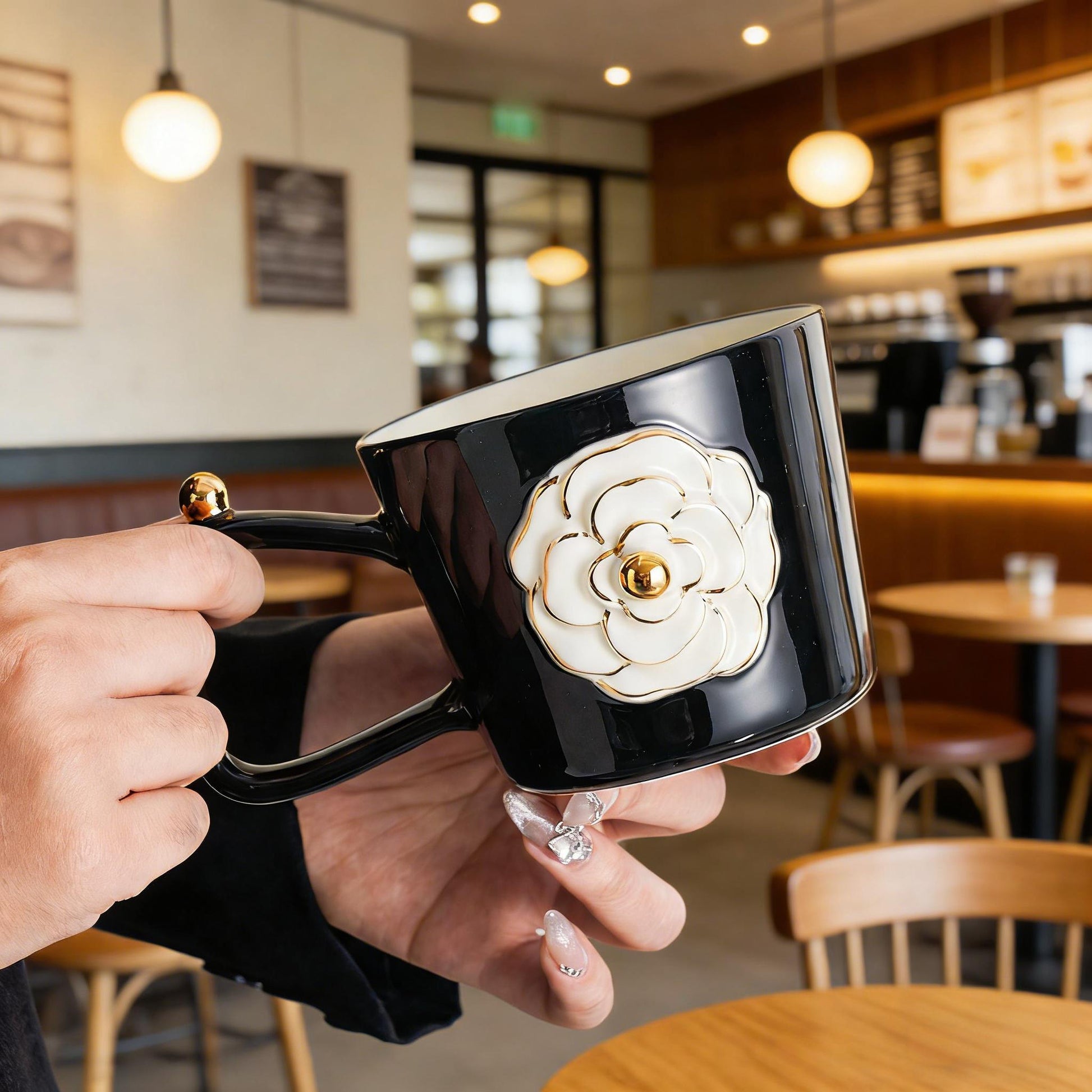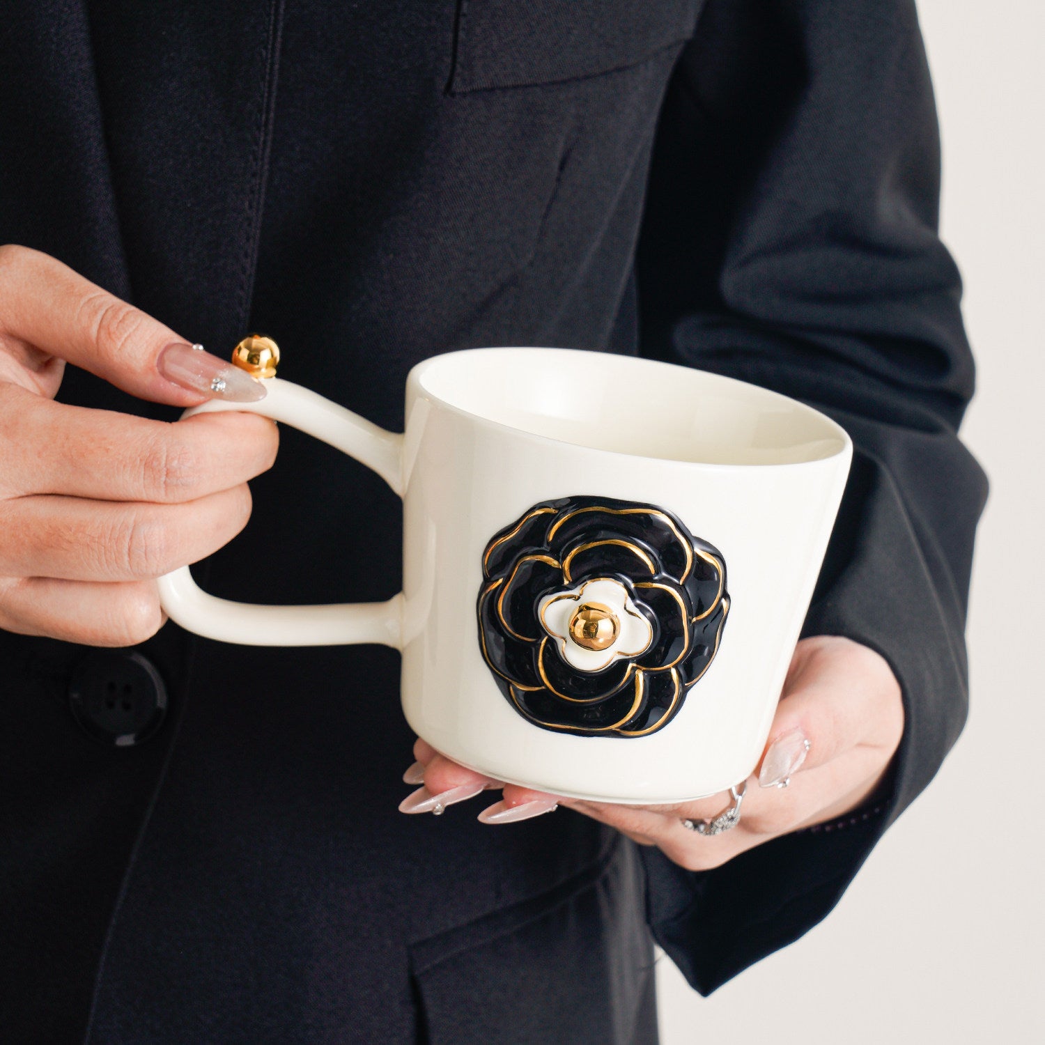Vintage Gold-Trimmed Camellia Relief Ceramic Mug - Elegant Coffee Cup for Women, Home & Office